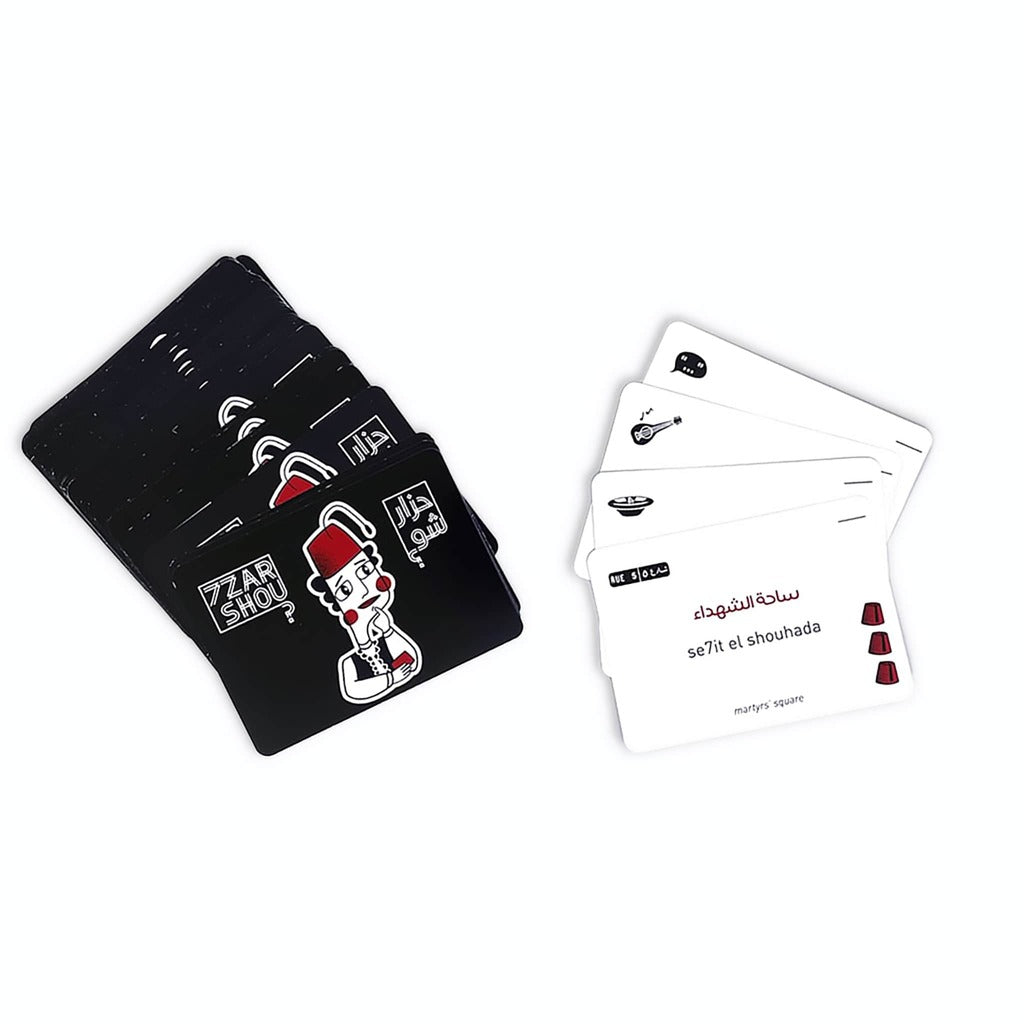 | A game of Lebanese Charades with a twist! 7zar Shou, the base game, is perfect for your next gathering with family and friends. It is jam-packed with everything Lebanese, from expressions to famous songs, locations and food. 7zar Shou offers 2 modes of play; the Classic Charades mode or a more challenging “Mahdoumeh bass Malghoumeh” mode that includes the Perk & 7zar Kif cards that allow you to impose restrictions on opposing teams or add fun ways of acting like "Teshwish on". Teams compete to collect the most Trabish. The game also includes a special English translation for non-Lebanese friends to tag along! Kif el 7ames? Ready? Yalla! Box Contains: 268 Charade Cards 16 7zar kif Cards 16 Perks Cards 1 Sand Timer Manuals (English and Arabic) with 2 Gameplays |
