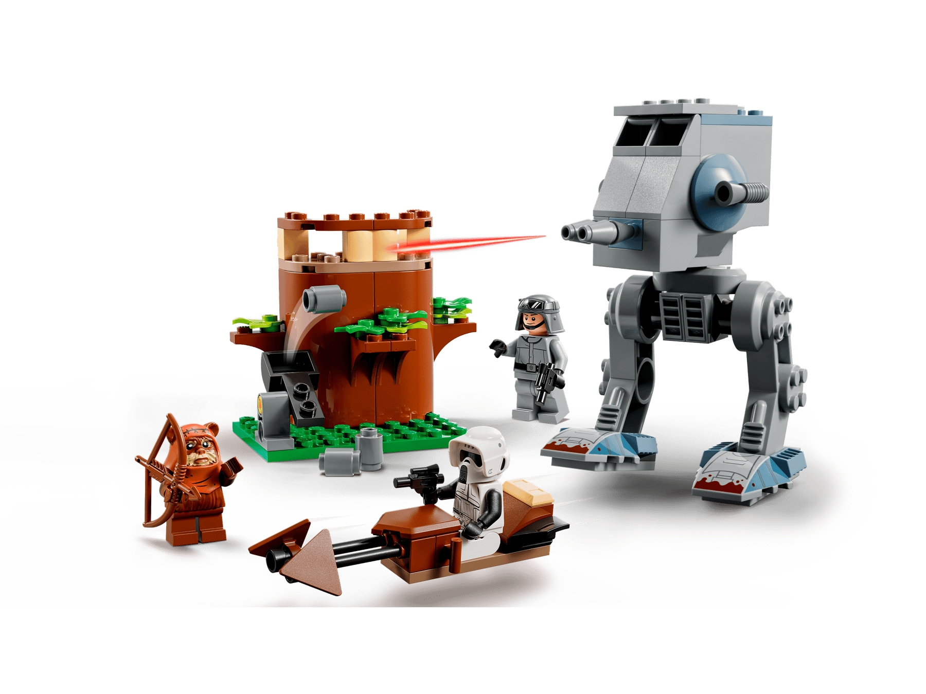 - Posable AT-ST walker, speeder and Ewok lookout – The AT-ST has a cockpit for the AT-ST Driver, and the Ewok hideoutfeatures a tree and a catapult for Wicket to launch stone elements