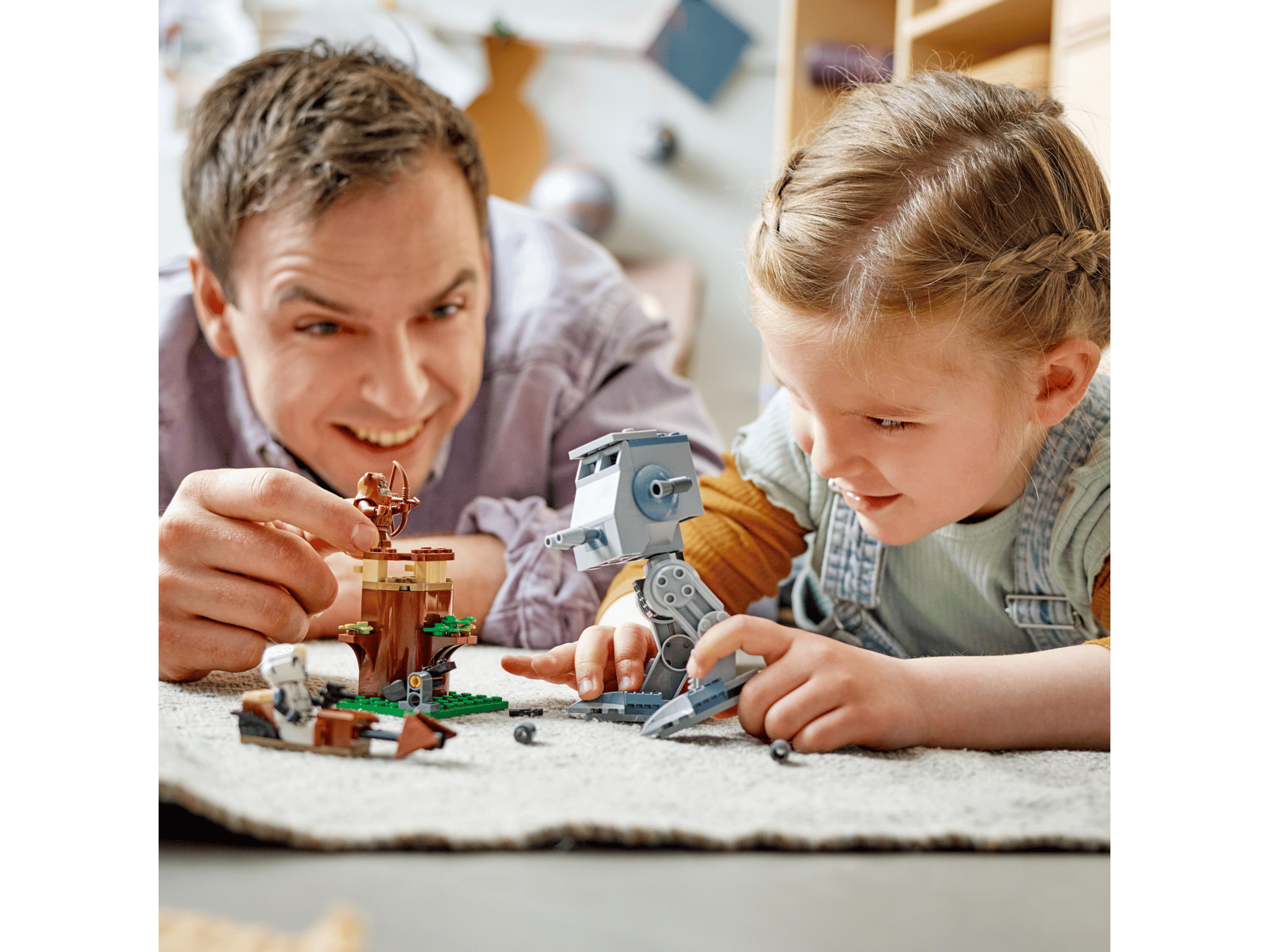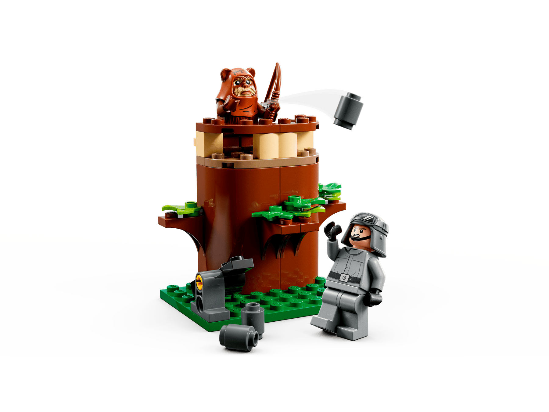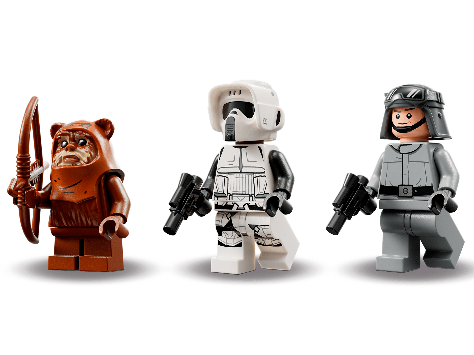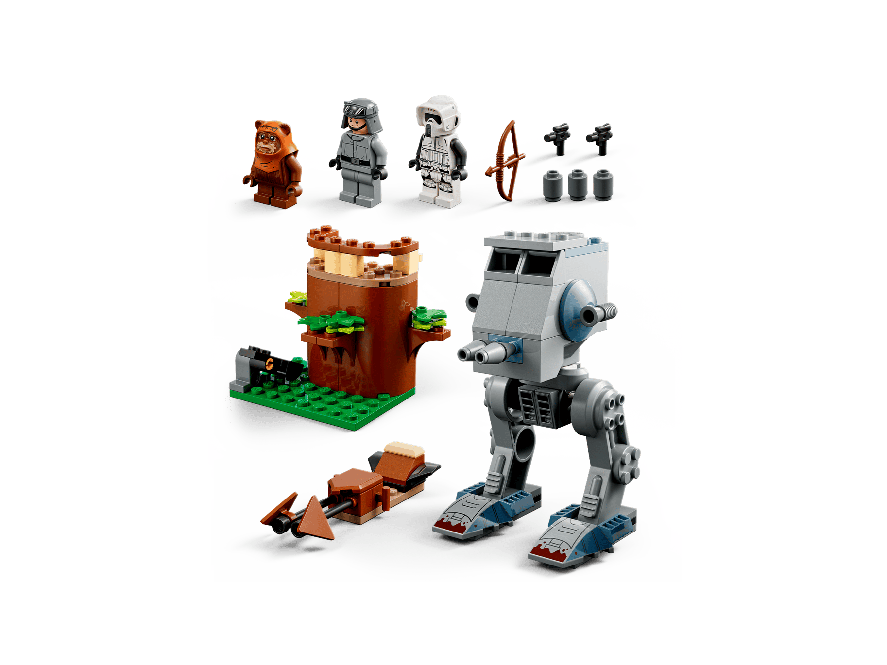 - 3 LEGO® minifigures with weapons – Wicket the Ewok with a bow and arrow, and a Scout Trooper and AT-ST Driver, each with a blaster pistol, to role-play Battle of Endor action