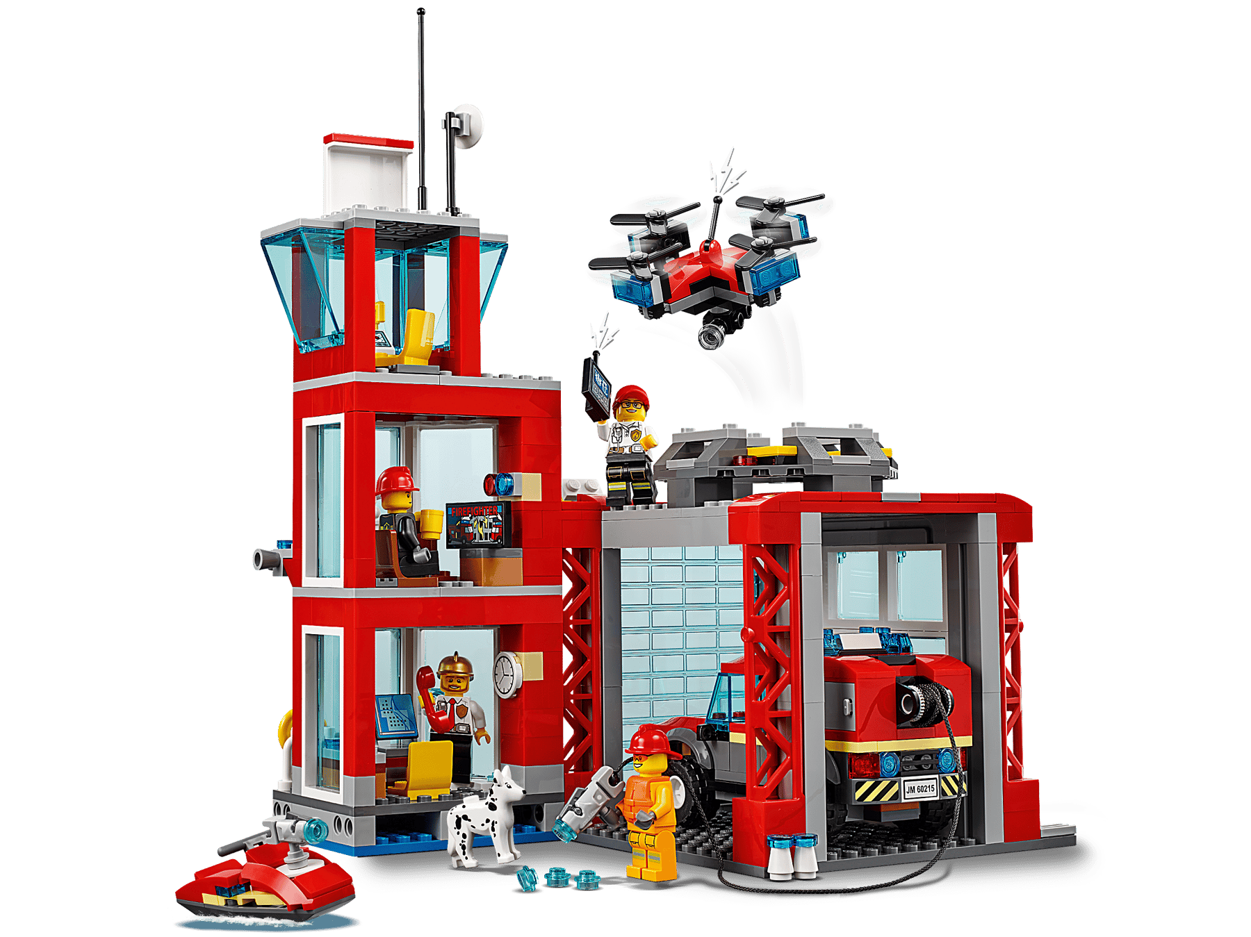 Protect the citizens of LEGO® City with the action-packed 60215 Fire Station, featuring a 3-level fire station with office, relaxation room and scout tower, small waterside dock and a separate garage with large opening front door and a landing pad for the detachable scouting drone with spinning rotors and camera. This cool set also features a fire off-road vehicle with a stud-shooting fire hose and new-for-January-2019 working light and sound brick, plus a water scooter, 4 minifigures and a fire station dog figure.