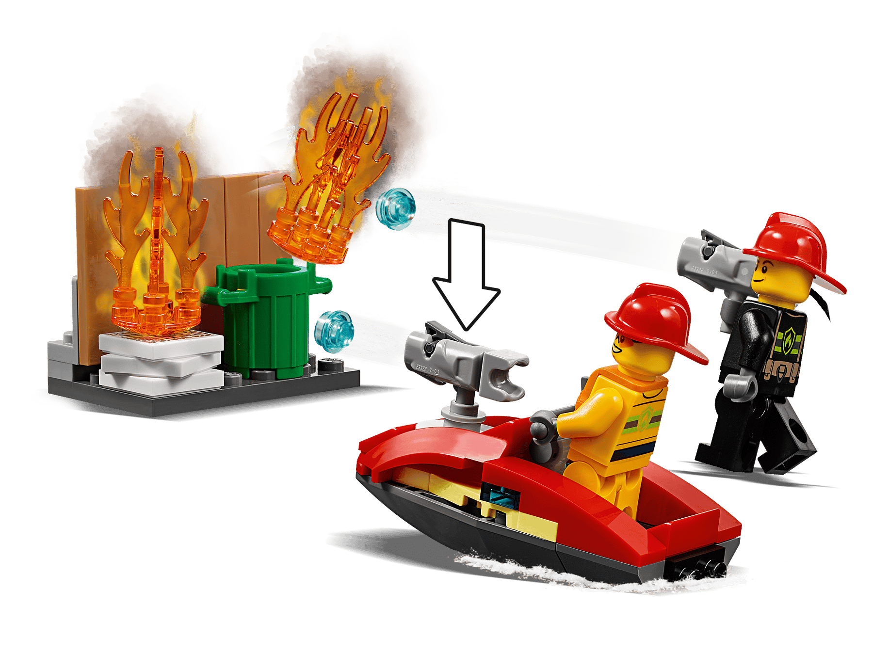 - This cool set also features a fire department off-road vehicle with new-for-January-2019 working light and sound brick, working fire hose with lever and storage compartments, plus a water scooter with space for a stud-shooting fire extinguisher and a scouting drone with spinning rotors and a rotating camera.