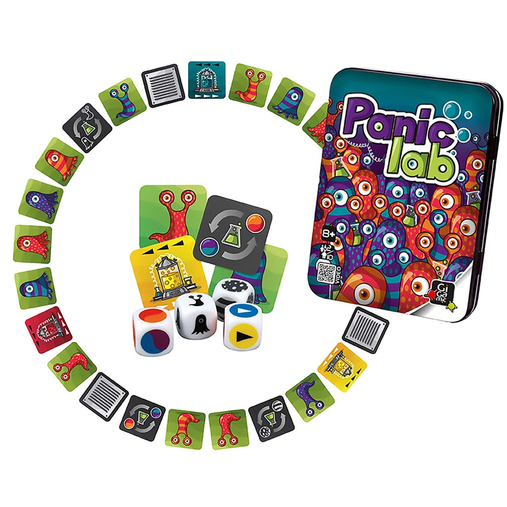 Panic Lab is a terrific “brain burning” challenge you will love. Dice are rolled to tell you which amoeba you are looking for and which lab they escaped from. That sounds easy, but they mutate and escape through the air vents. Can you match the correct amoeba before your opponents? Panic Lab is one of the best games for people with cool heads, sharp eyes and fast hands. Box Contains: 25 illustrated squares 4 very special dice 30 Counters 1 Rulebook Info Language: English Age: 8+ No Players: 2 - 10 Game Time: 30 min |