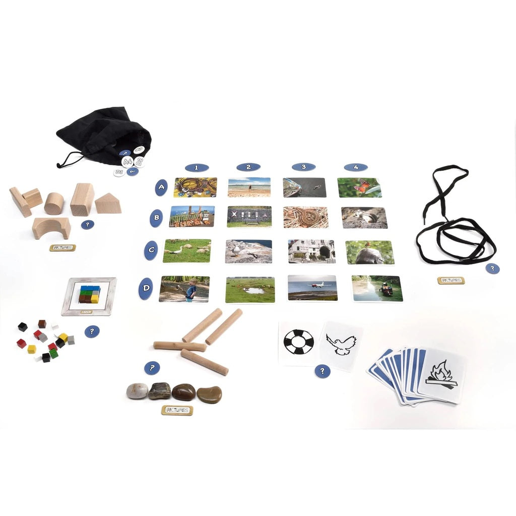 | Pictures is a quick-play family game with very simple rules! Form the image on your secret picture card with one set of materials; either shoelaces, colored cubes, icon cards, sticks and stones or building blocks, in such a way that the other players guess what image you have pictured: Pull out a marker from the bag that determines your secret picture Rebuild that image with your components for it to be recognizable. And finally guess what image every player has pictured. They must also guess yours! The players get points for correctly guessing other players images and for other players guessing their image. The player with the most points wins! Box Contains: 91 Double-sided photo cards 19 Icon cards 56 Markers 1 Picture frame 4 Picture plates 24 Colored cubes 4 Sticks & 4 stones 2 Shoelaces 6 Building blocks 1 Cloth Bag 1 Notepad 1 English Rulebook 1 Arabic Rulebook Info Language: English and Arabic Age: 8+ No Players: 3 - 5 Game Time: 30 mins |
