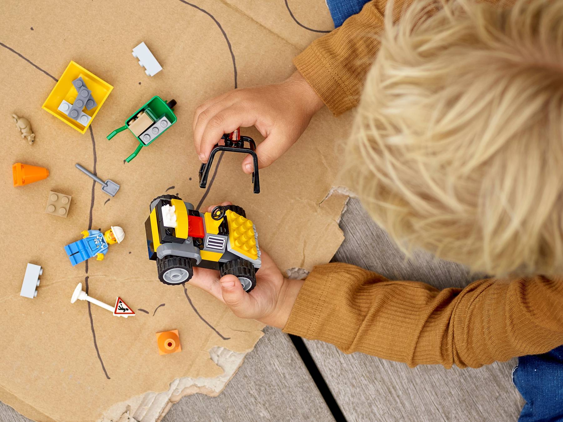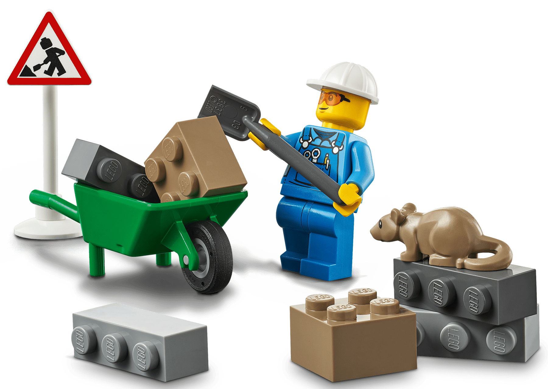- Kids can cordon off areas with the roadworks sign and traffic cones, fill and tip the front-end loader's bucket and play out fun scenarios featuring the road worker minifigure and rat figure.
